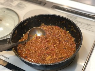 豚挽肉と玉ねぎとトマト缶でつくる豚キーマ。