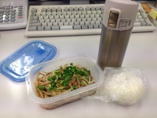 今日の昼飯はお握りとモヤシ炒めと茄子の味噌汁。