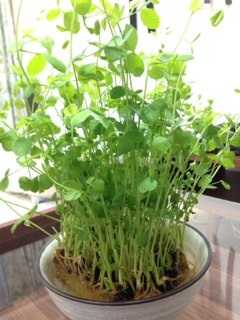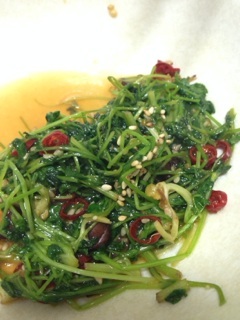 ゴマ油をひいたフライパンに豆苗と味覇と鷹の爪。