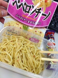 今日はペペロンチーノとうまい棒(差し入れ)。
