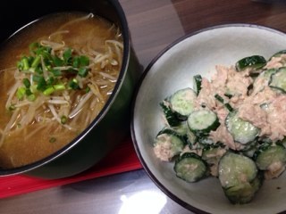 今夜のメニューはもやしラーメンとキュウリのサラダ。