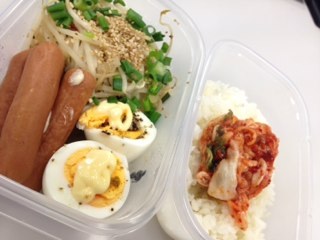 今日の弁当はもやし炒めとソーセージ、茹で卵、