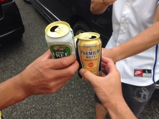 車組はノンアルコールビール、電車組はプレミアムモルツ。