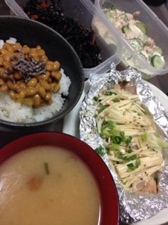 鮭のホイル焼き、ひじき、ツナマヨきゅうり、なめこ味噌汁、納豆。