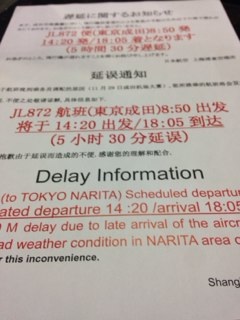 昨夜からの濃霧の影響で飛行機が5時間遅れだって。