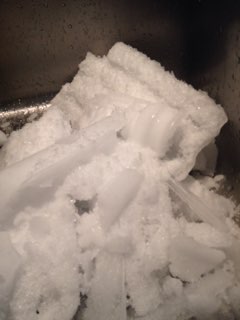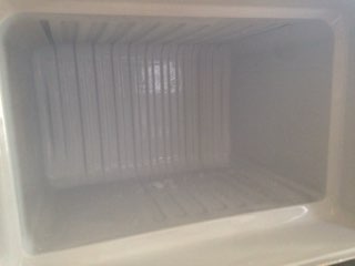 冷蔵庫の電源を切り、冷凍庫にこびりついた大量の霜を取り除きました。