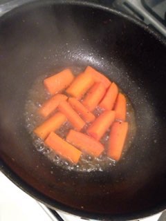 砂糖とバターを溶かした煮汁で柔らかくなるまで茹で、