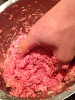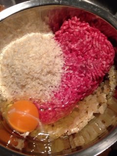 そこに合挽肉(割合はお好みでOK)、パン粉、卵、