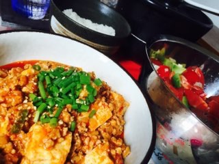 麻婆豆腐に、トマトとアボカドのサラダ。