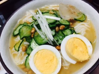 味噌と生姜を溶いただし汁に、納豆ときゅうりを入れて