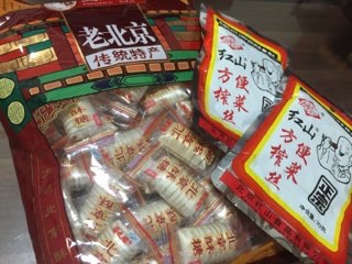 飴(?)にくるまれた落花生の不思議なお菓子と搾菜をもらった。