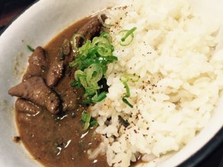 おでんの残り汁で炊いたごはんにモツ煮込をかけて食べてる。