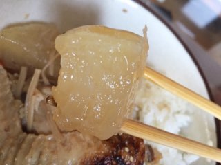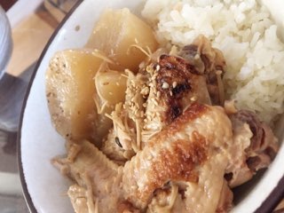 一晩置いてあった手羽先と大根の煮物をごはんにかけて食べる。