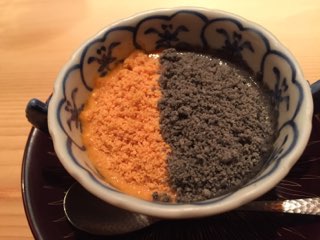 温かい茶碗蒸しの上に冷たいかにみそとイカ墨のシャーベットを乗せた料理。