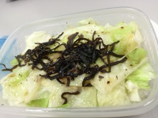 ごはんの上にざく切りキャベツと塩こんぶを乗せて