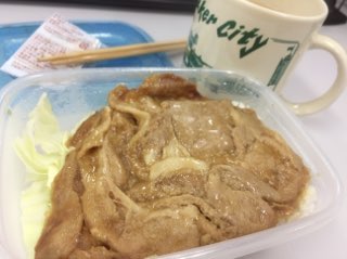 生姜醤油に漬けこんだ豚肉を焼いて、ごはんと刻みキャベツに載せるだけ。