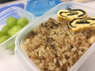 きのこの炊き込みご飯と玉子焼き、そしてなんとデザートにぶどう。