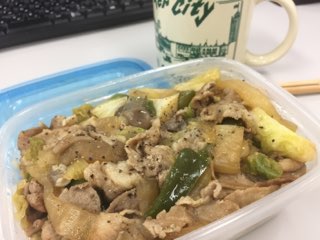 今日のお弁当は、ごはんの上に昨晩の余りものを乗せたどんぶり方式。
