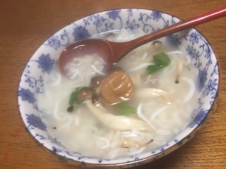 朝ごはんは軽めに、梅干とシラスとキノコのおかゆを作った。