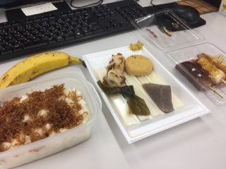 今日のお昼ごはんは、おでんとおだんご、そしてバナナ。