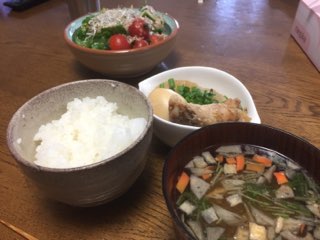 手羽元の煮つけに根菜スープ、水菜のサラダ。
