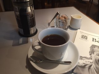 珈琲の横にある英字新聞っぽいのは