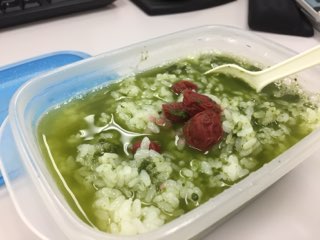 お弁当のご飯に粉末緑茶をかけたら何だか不思議な色合いになった。