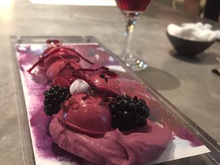 アーティスティックなお皿に華やかに盛り付けられた芋。