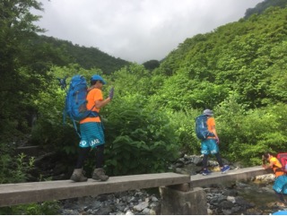 渓流にかかった橋を渡るよ。