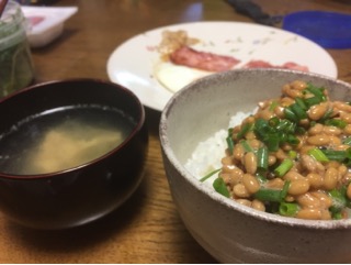 納豆とお吸い物、ベーコン付きの目玉焼き。