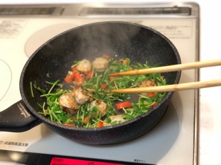 そこにホタテとパプリカ、豆苗をつっこんで塩胡椒。