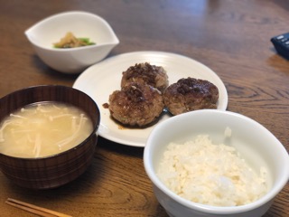 生姜風味のハンバーグときのこの味噌汁が嬉しい朝。