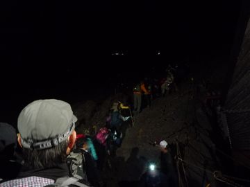 山頂まで続く登山客のヘッドライトの明かりが道のように見える中で、