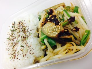 今日は茄子とニラともやしの炒め物にふりかけごはんだ。