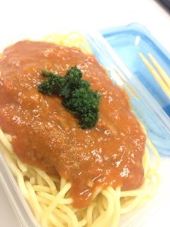 パスタソース、粉チーズ(たっぷり)、パセリの順で盛り付ける。