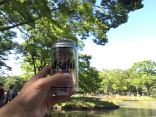 噴水横の木陰に陣取り、缶ビールを流し込む。