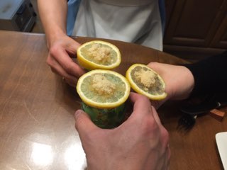 ラムを注いだグラスの上にスライスしたレモンとお砂糖を載せ、