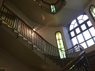 2階へと続く階段にはステンドグラスがあしらわれ、