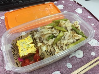 ごはんの上にのっけた豚肉とアスパラの炒め物、