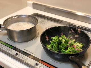 ブロッコリーは下茹でしてペペロンチーノ風に味付け。
