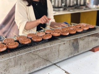 ソーセージをぐるぐるにして焼いた串。