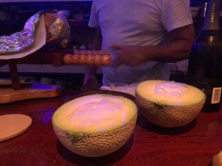 メロンをくり抜いて果肉と合わせながらシャンパンをいただきます。