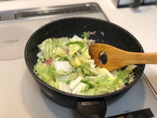 香りがたってきたら白菜、ベーコン、しめじを突っ込んで炒めて、
