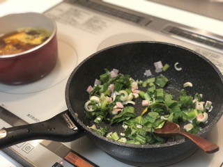 小松菜を使って高菜風チャーハンを作るよ。