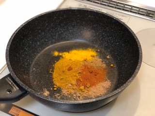 まず、スパイスに炒って香をたてます。
