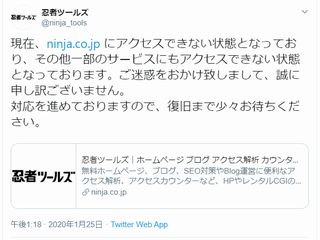 1月25日に発生した「忍者ツールズ」のシステム障害の影響で