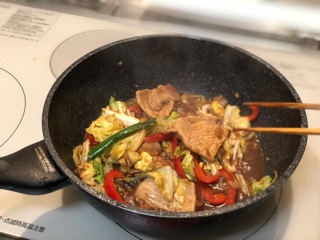 1. 油をしいたフライパンで豚肉を焼く