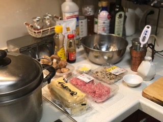 材料は豚ひき肉、ショウガ、しいたけ、浅利のむき身、オイスターソース。